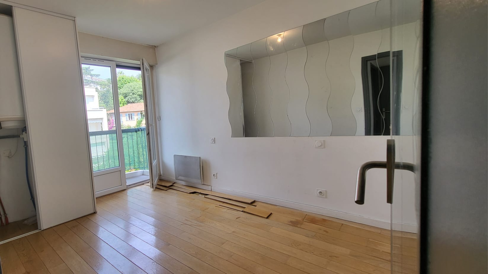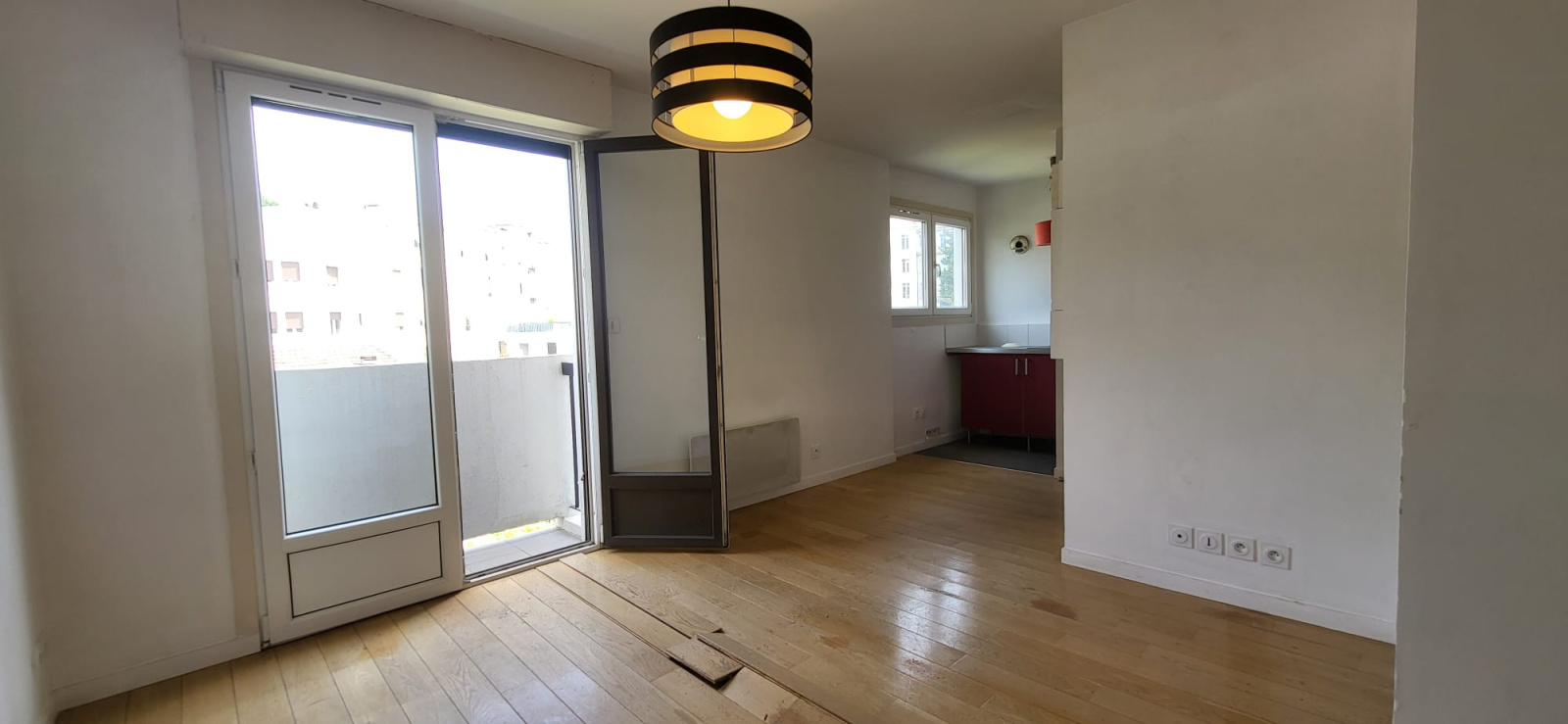 Un séjour lumineux avec coin cuisine et accès à un balcon,